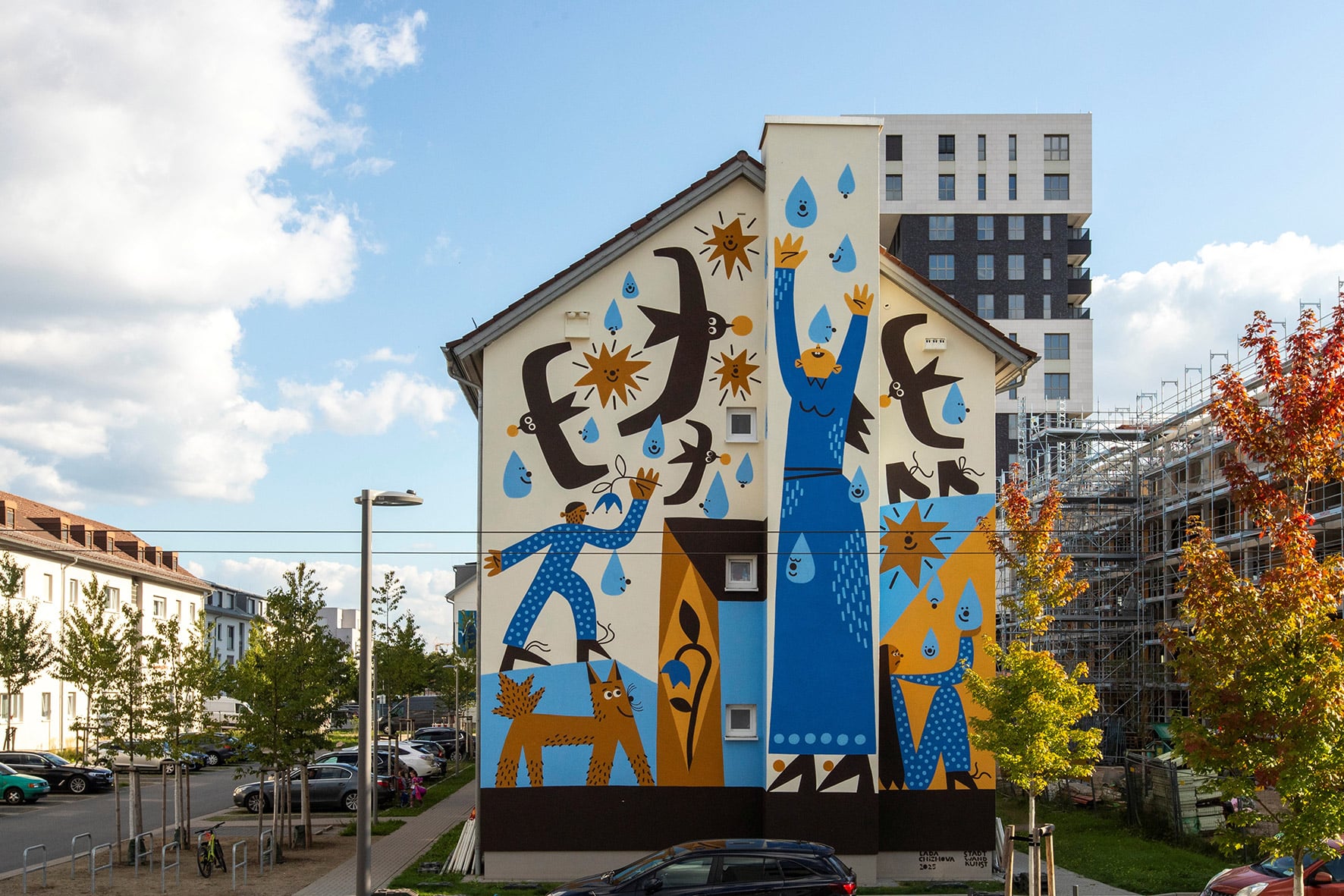 Ein neuer Blickfang für den Stadtteil FRANKLIN: Anfang Oktober hat die Mannheimer Künstlerin Lada Chizhova im Rahmen des Street-Art-Projekts STADT.WAND.KUNST das großformatige Wandbild „Der Regen“ an der Fassade des GBG-Wohnhauses in der Thomas-Jefferson-Straße 54 vollendet. Auf über zehn Metern Höhe zeigt das Werk eine eindrucksvolle Szene, die nicht nur optisch, sondern auch emotional wirkt. Chizhova ließ sich bei der Gestaltung von den Wetterbedingungen während des Malprozesses inspirieren – Regentropfen fließen ins Bild ein, ebenso wie eine klare Botschaft: Leichtigkeit und Zuversicht, auch wenn das Leben einmal nicht nach Plan verläuft. Ein besonderer Blickfang sind die Schwalben, die symbolisch für Freiheit stehen – und gleichzeitig einen ganz realen Bezug zur Fassade haben: In den Nistkästen vor Ort sind sie tatsächlich zuhause. Das Mural ist Teil des Mannheimer Projekts STADT.WAND.KUNST, das seit 2013 internationale und regionale Street-Art-Künstler*innen in die Stadt bringt – und dabei jedes Jahr auch Fassaden aus dem Gebäudebestand der GBG nutzt. Was mit einem ersten gemeinsamen Wandbild des Künstlerduos HERAKUT in F6 begann, hat sich zu einer stetigen Kooperation entwickelt. Mehr als 40 Murals prägen mittlerweile das Stadtbild und sorgen dafür, dass Mannheim heute als Open Urban Art Museum überregional wahrgenommen wird. Copyright © Alexander Krziwanie / STADT.WAND.KUNST